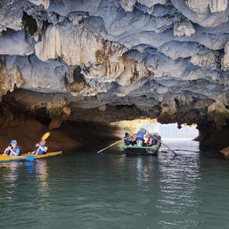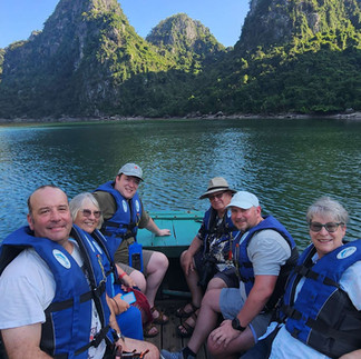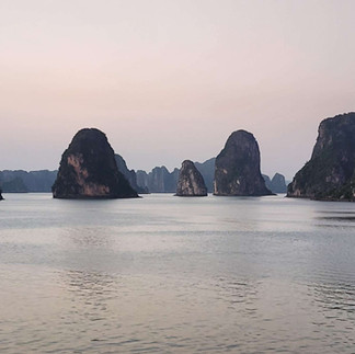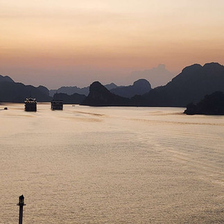 We got to go on a guided boat trip through a "cave" which was really just a tunnel through a cliff by boat, nice views and the guy rowing the boat started singing some nice soothing Vietnamese song. We then returned back to the boat before getting changed to head out on another boat to go kayaking and a swim. Gill, Mike and James headed out on the kayaks on their own and I headed out with Mum on a double kayak, we got to take in the views for about 15 minutes before turning around and heading back to the dock. Once back it was time for a quick swim, the water was fantastically warm, turns out only us 5 went swimming. Eventually we had to head back to the boat where we could shower and change before heading up to the 4th deck to enjoy the views at sunset while enjoying some finger food... Wasn't really much finger food, turns out the big group seem to think that was also a buffet.